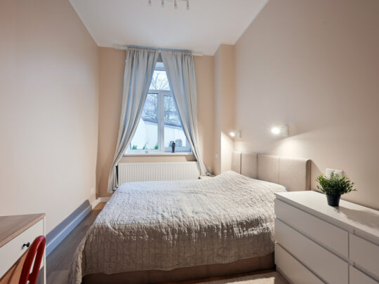 Piedāvājam iegādāties elegantu 2 istabu dzīvokli renovētā dzīvokļu namā Āpšu ielā. Tas atrodas klusajā Torņkalna apkaimē, vienlaikus atrodoties tikai 5 minūšu brauciena vai 20 minūšu gājiena attālumā no Vecrīgas. Visi logi uz skaisti iekoptu slēgtu pagalmu.