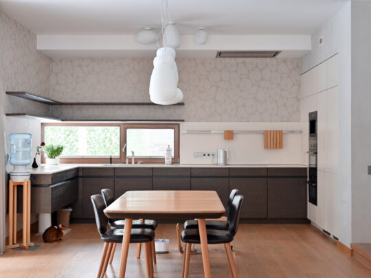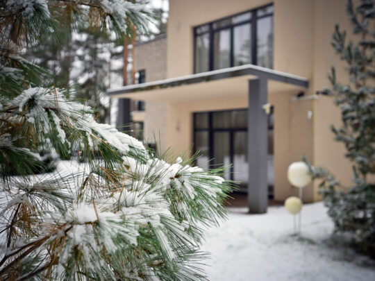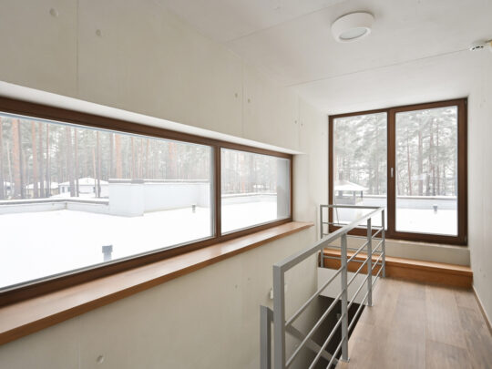 Mājā izmantoti tikai augstākās kvalitātes materiāli un pasaulē atzīti zīmoli – ozolkoka grīdas, koka logi, mūrētas sienas ar betona apdari, izsmalcināts interjers un augstas klases tehnika. Komfortu nodrošina Daikin rekuperācijas sistēma, virtuvē un sadzīvē – Kuepperbusch tehnika, visā mājā uzstādīti JUNG rozetes un slēdži no Vācijas.