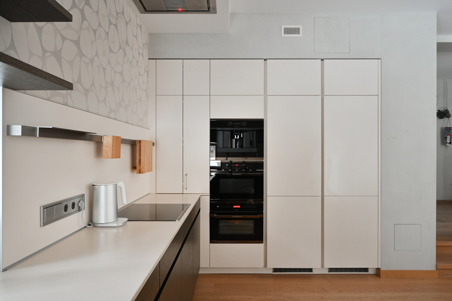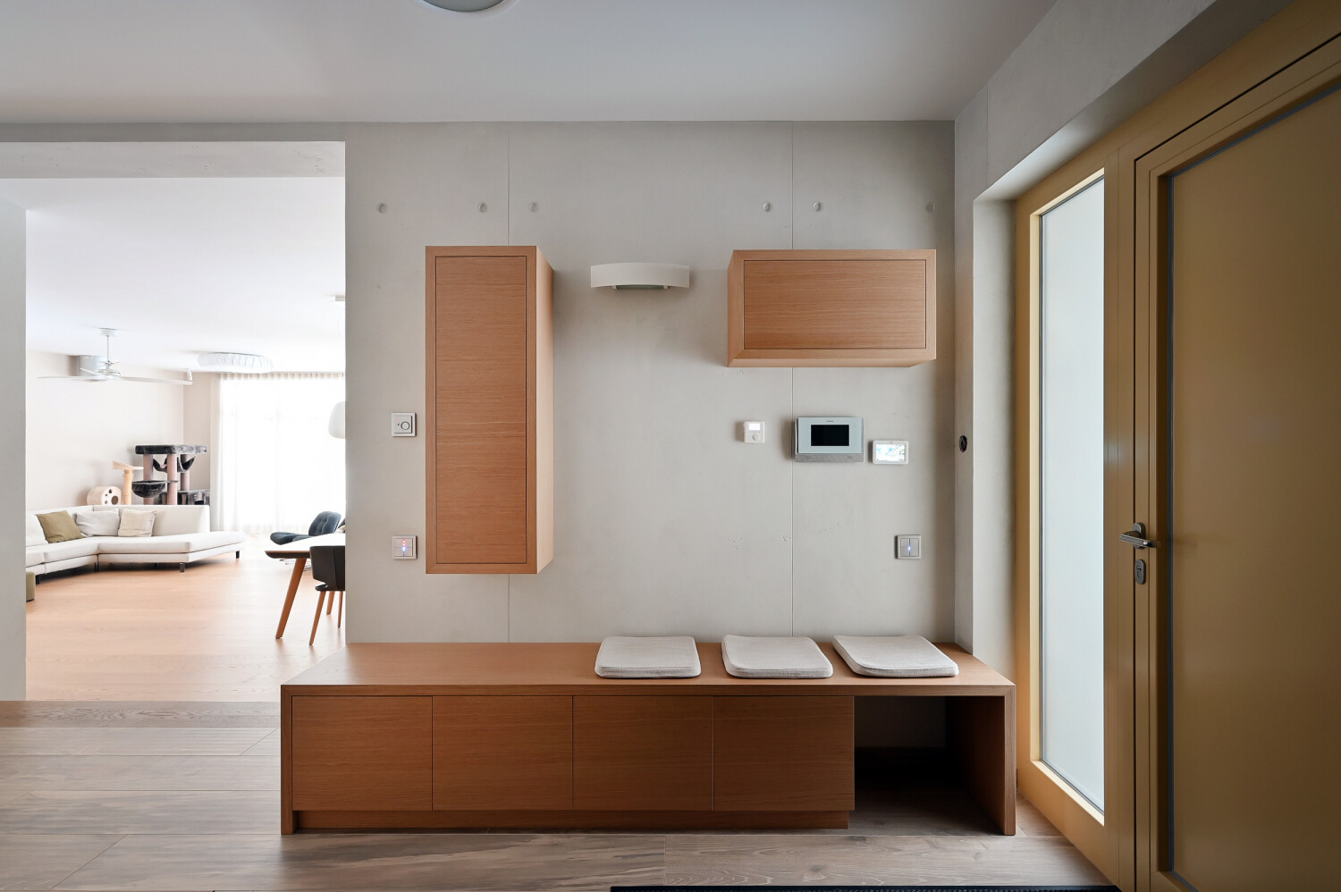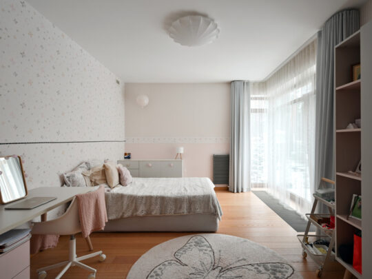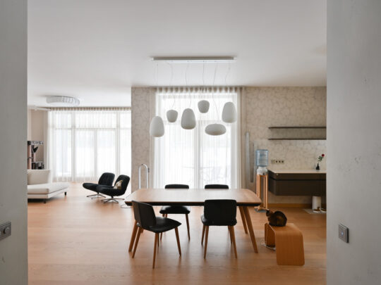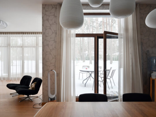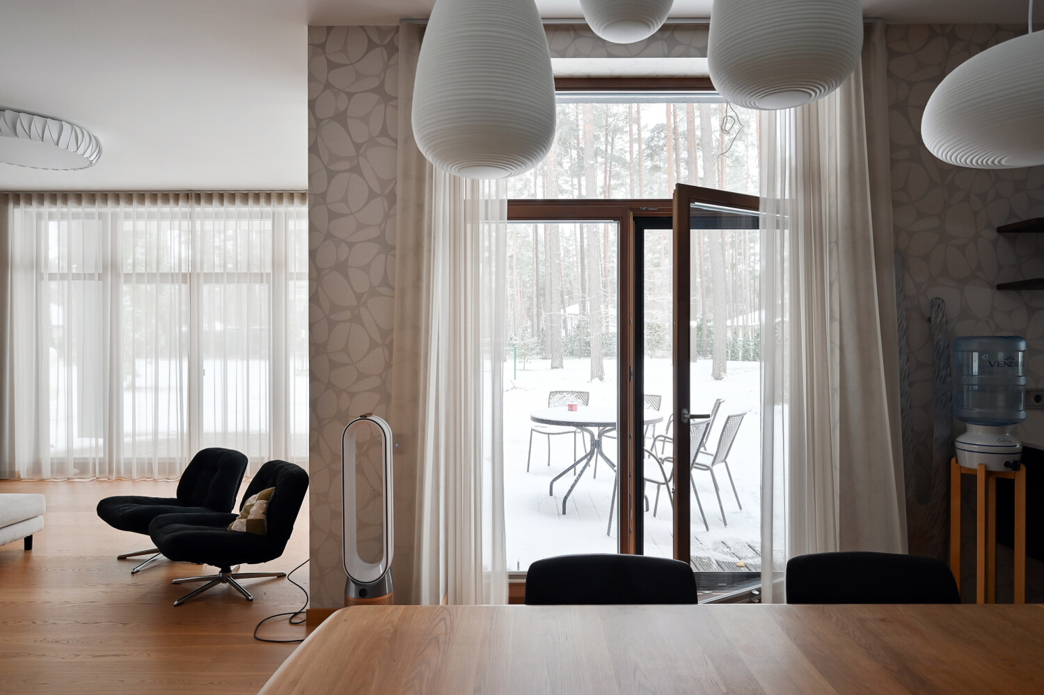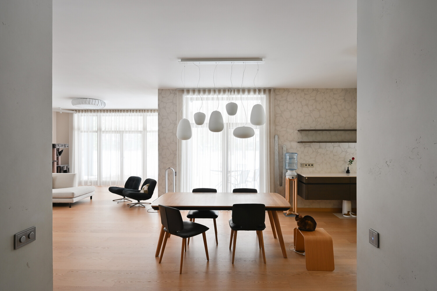Interjeru papildina augstvērtīgas dizaina mēbeles: viesistabā Minotti dīvāns, ēdamzonā galds un krēsli no TEAM 7, viesistabas mēbeles no Kate, guļamistabas mēbeles no MC2, garderobes sistēma – arī MC2, kā arī risinājumi no Excelsior. Katrs elements ir rūpīgi izvēlēts, veidojot harmonisku, ilgmūžīgu un reprezentablu vidi.