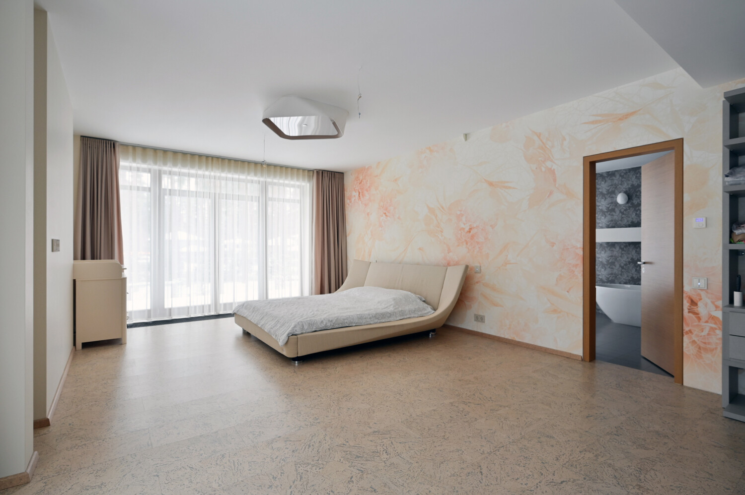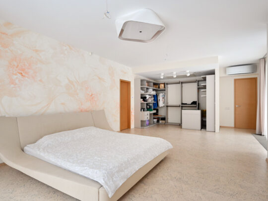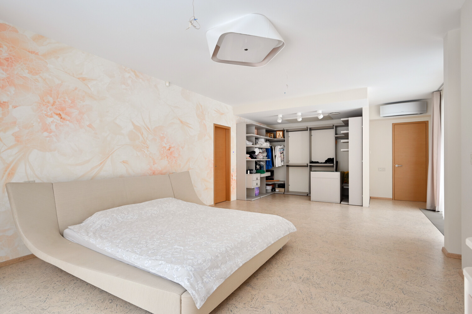 viena guļamistaba ar savu garderobi un privātu sanmezglu