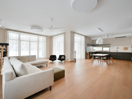 plaša, gaiša viesistaba apvienota ar virtuves zonu