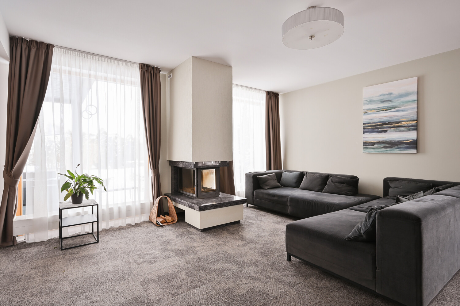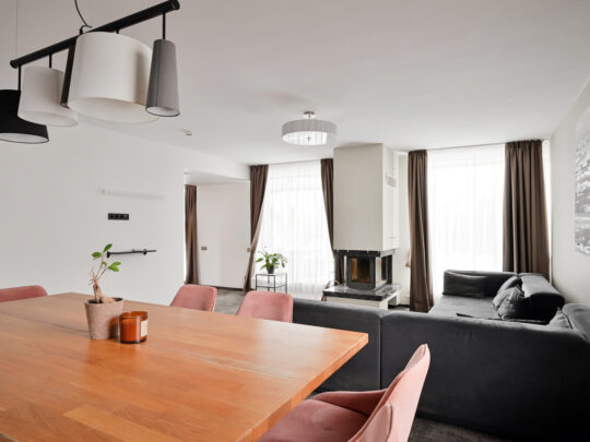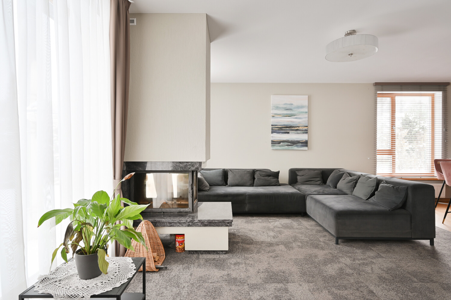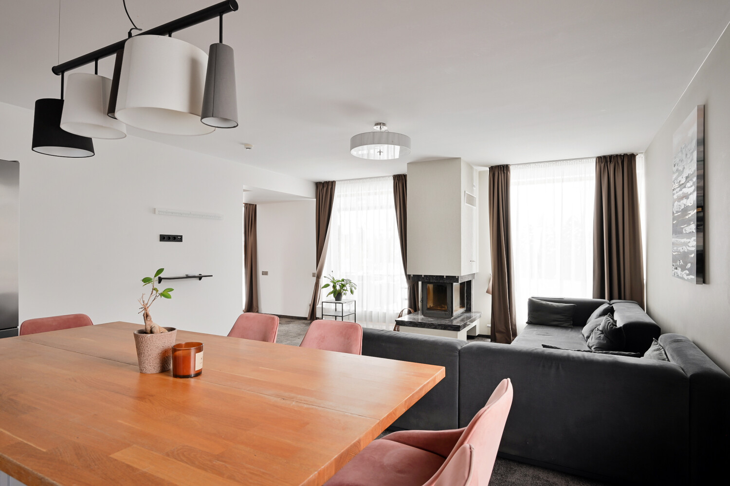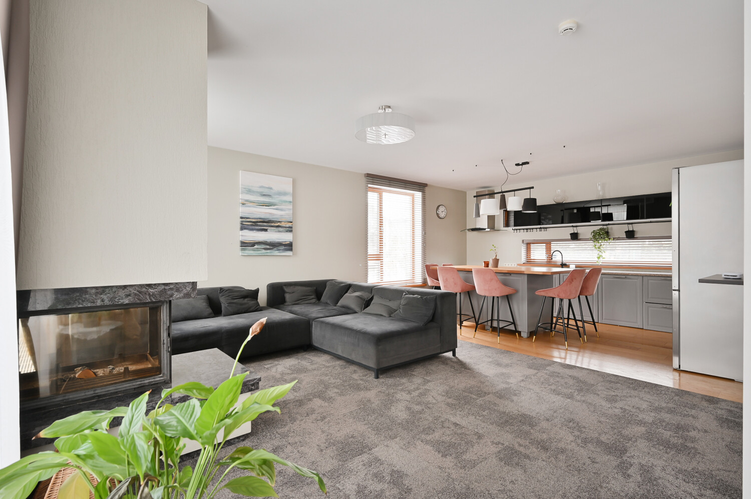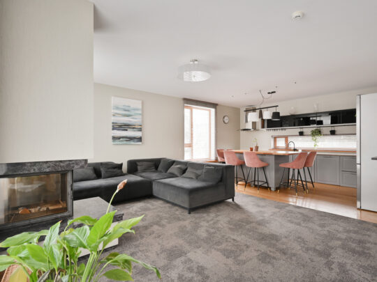 spacious living room with fireplace, partially combined with the kitchen