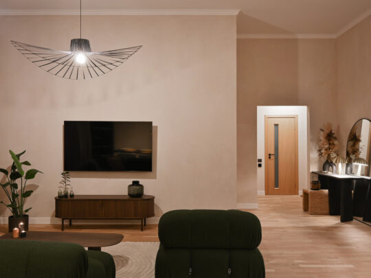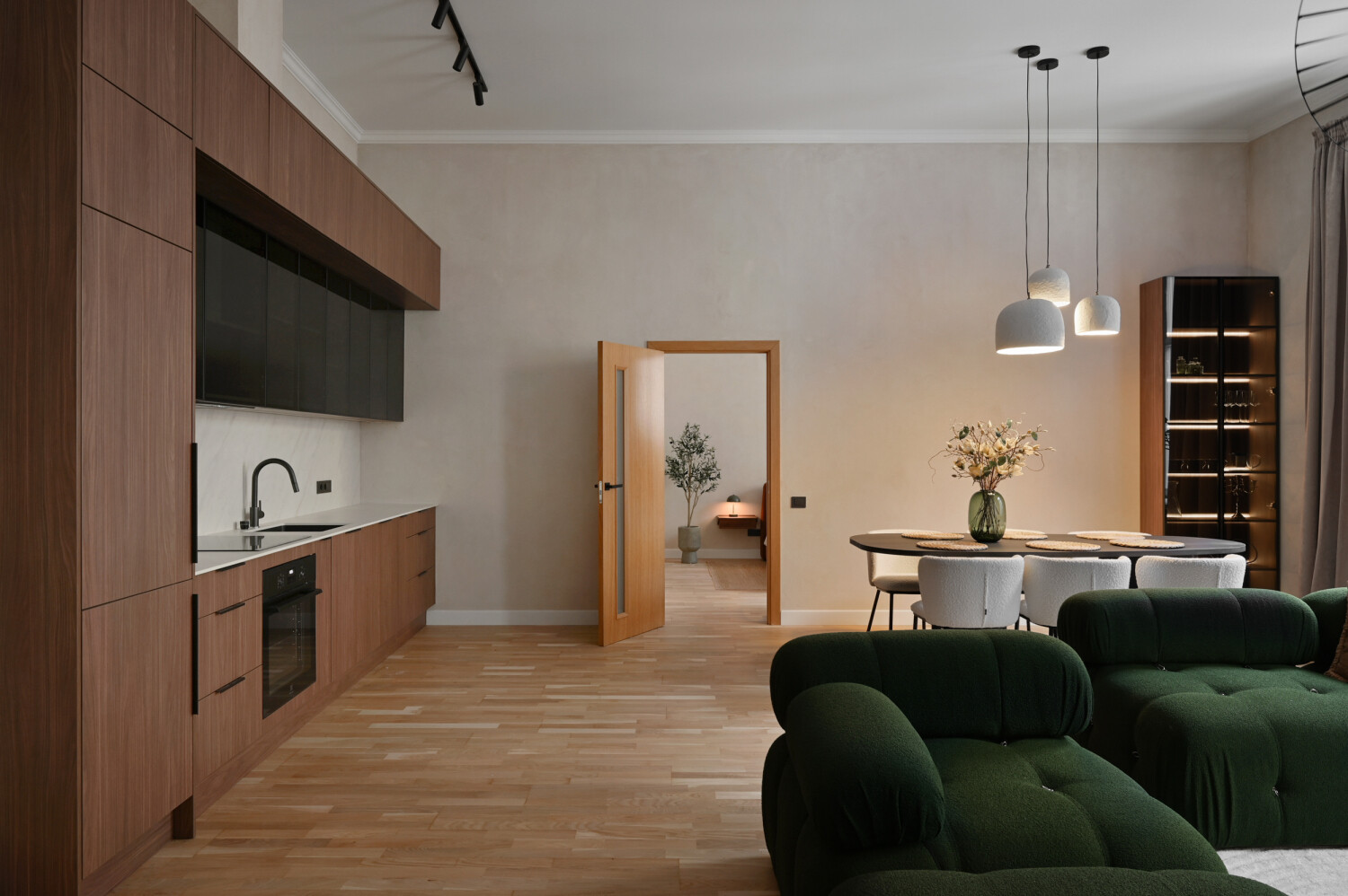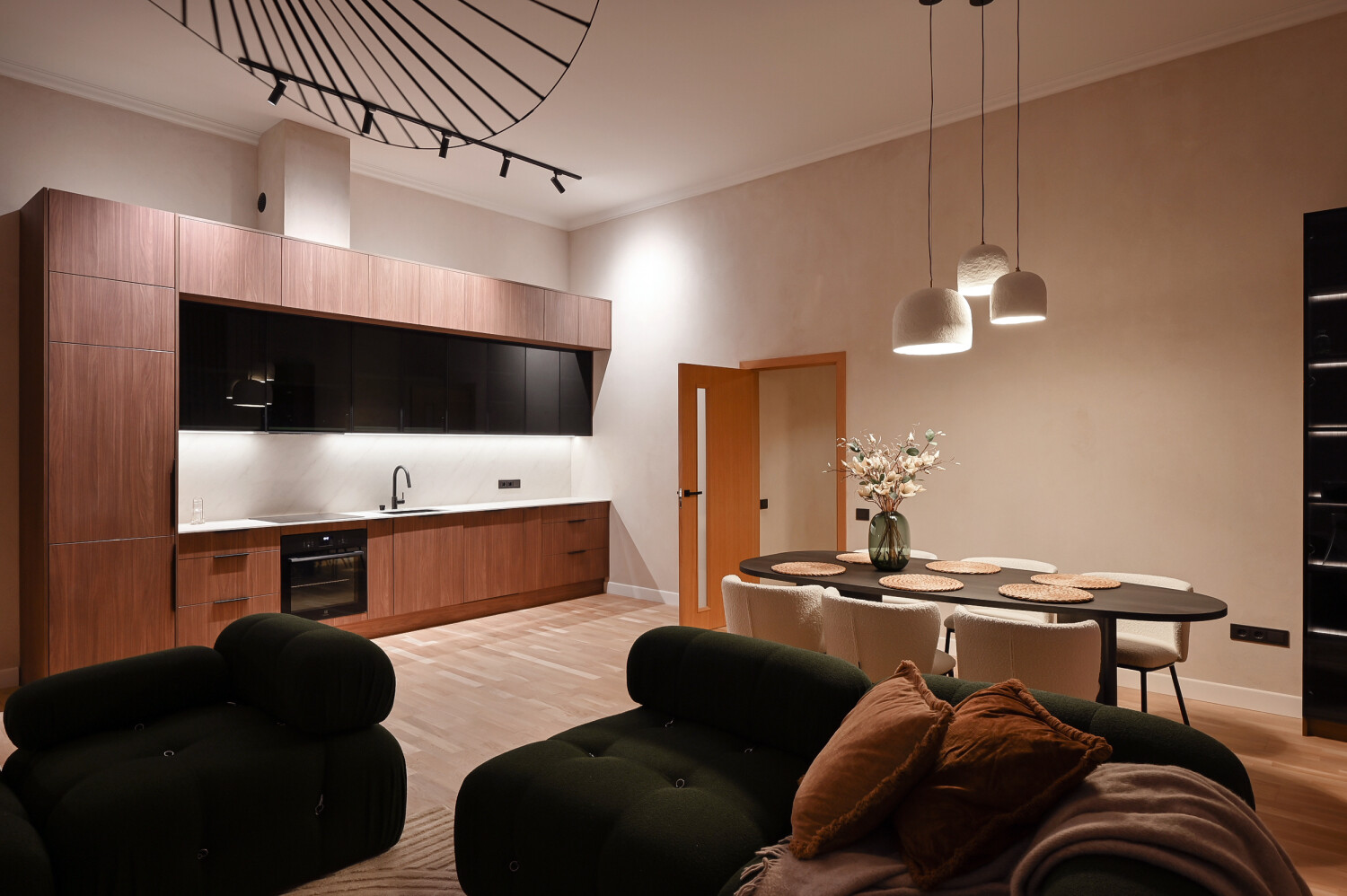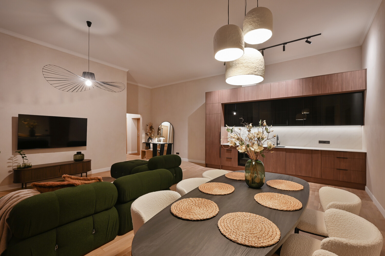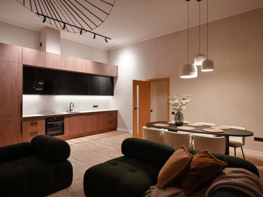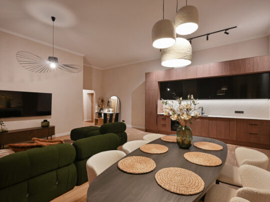Atvērtā tipa dzīvojamā zona apvieno elegantu viesistabu ar pilnībā aprīkotu virtuvi, radot ideālu vidi ikdienas komfortam.