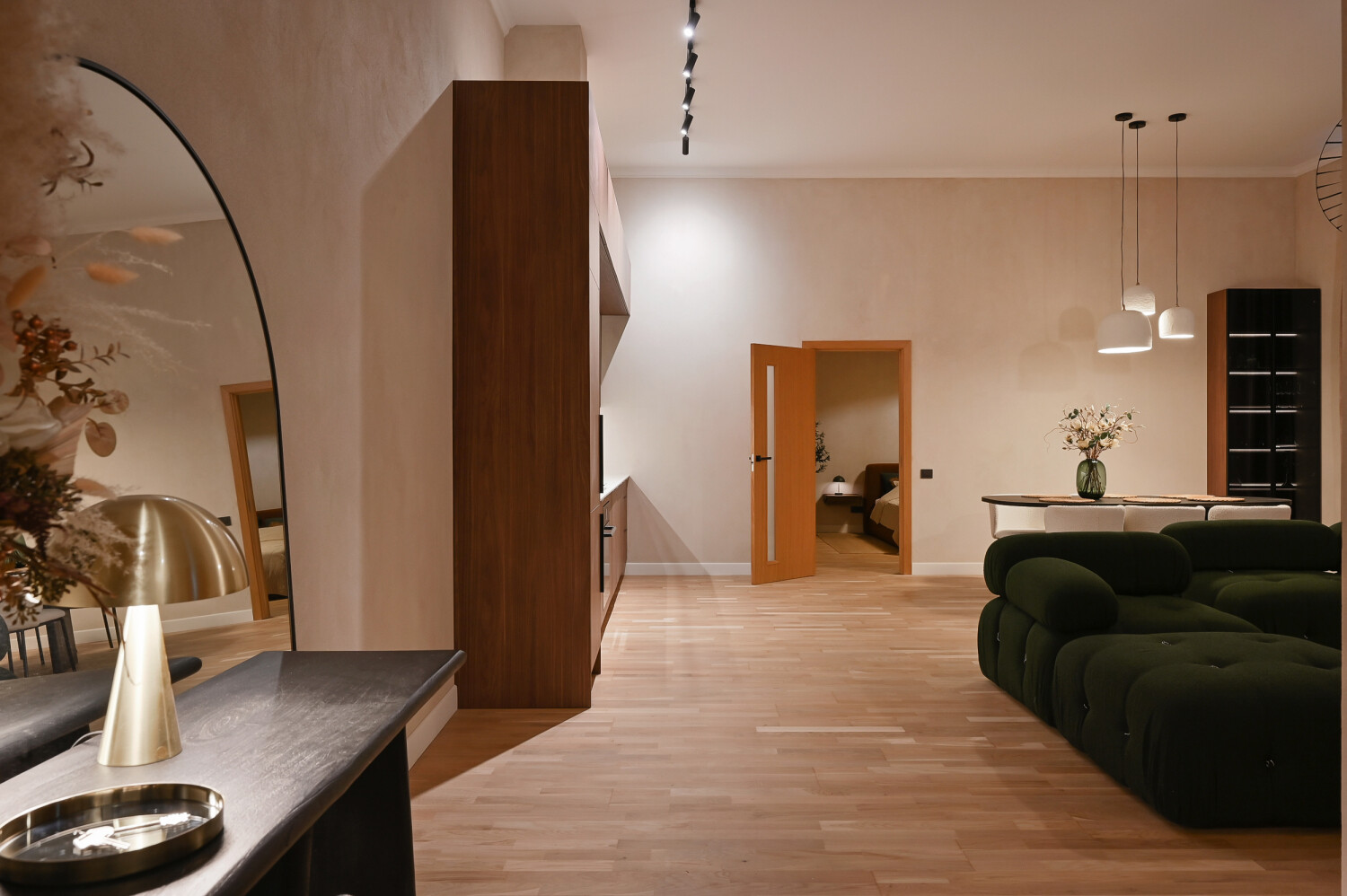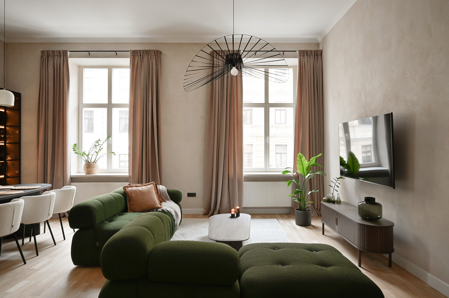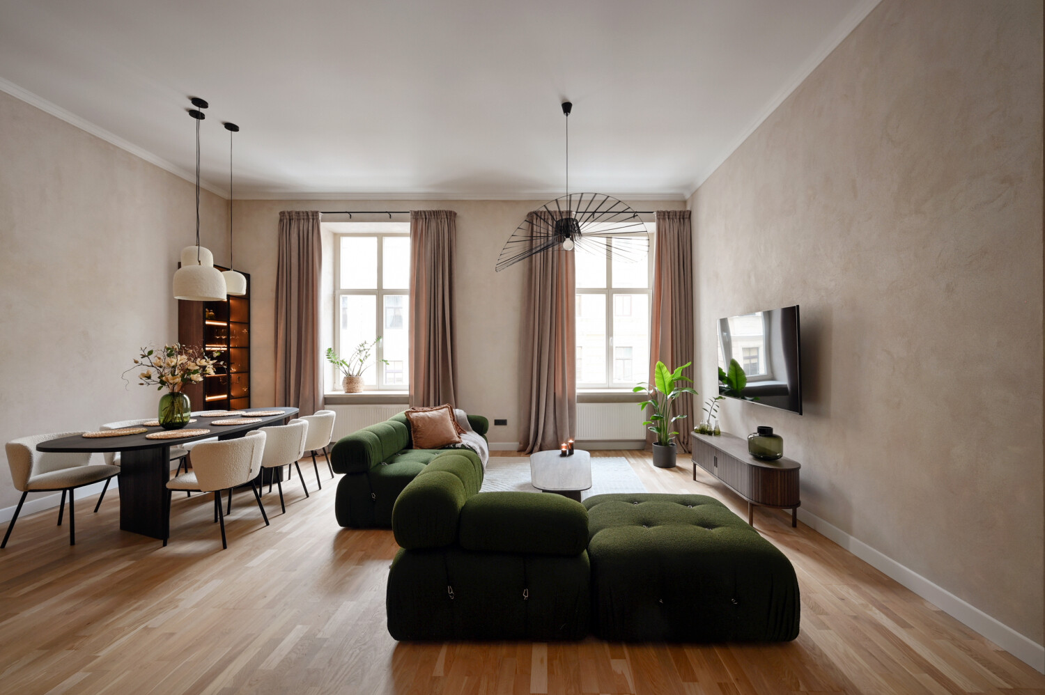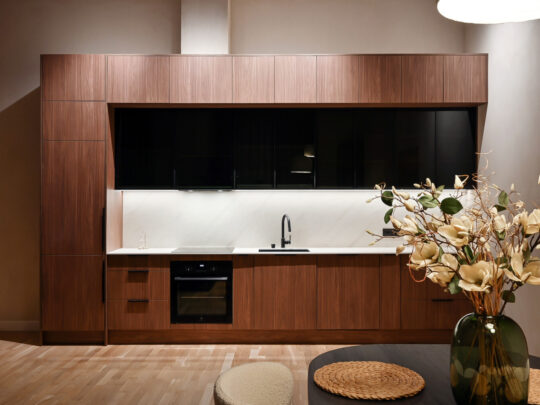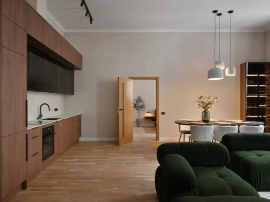 Atvērtā tipa dzīvojamā zona apvieno elegantu viesistabu ar pilnībā aprīkotu virtuvi, radot ideālu vidi ikdienas komfortam.