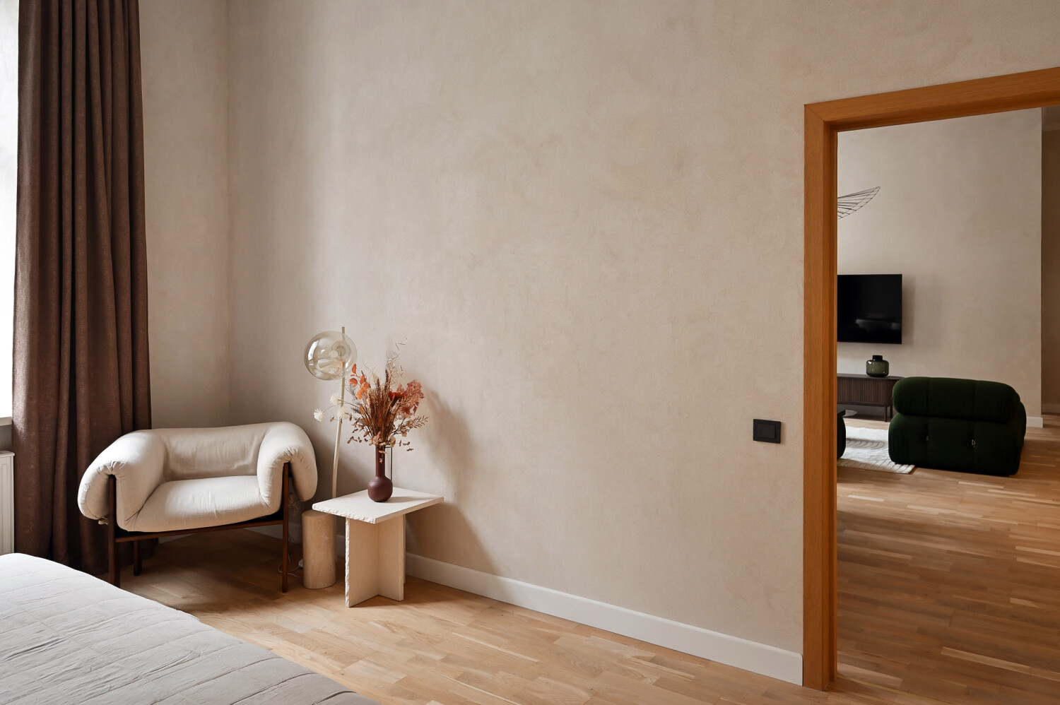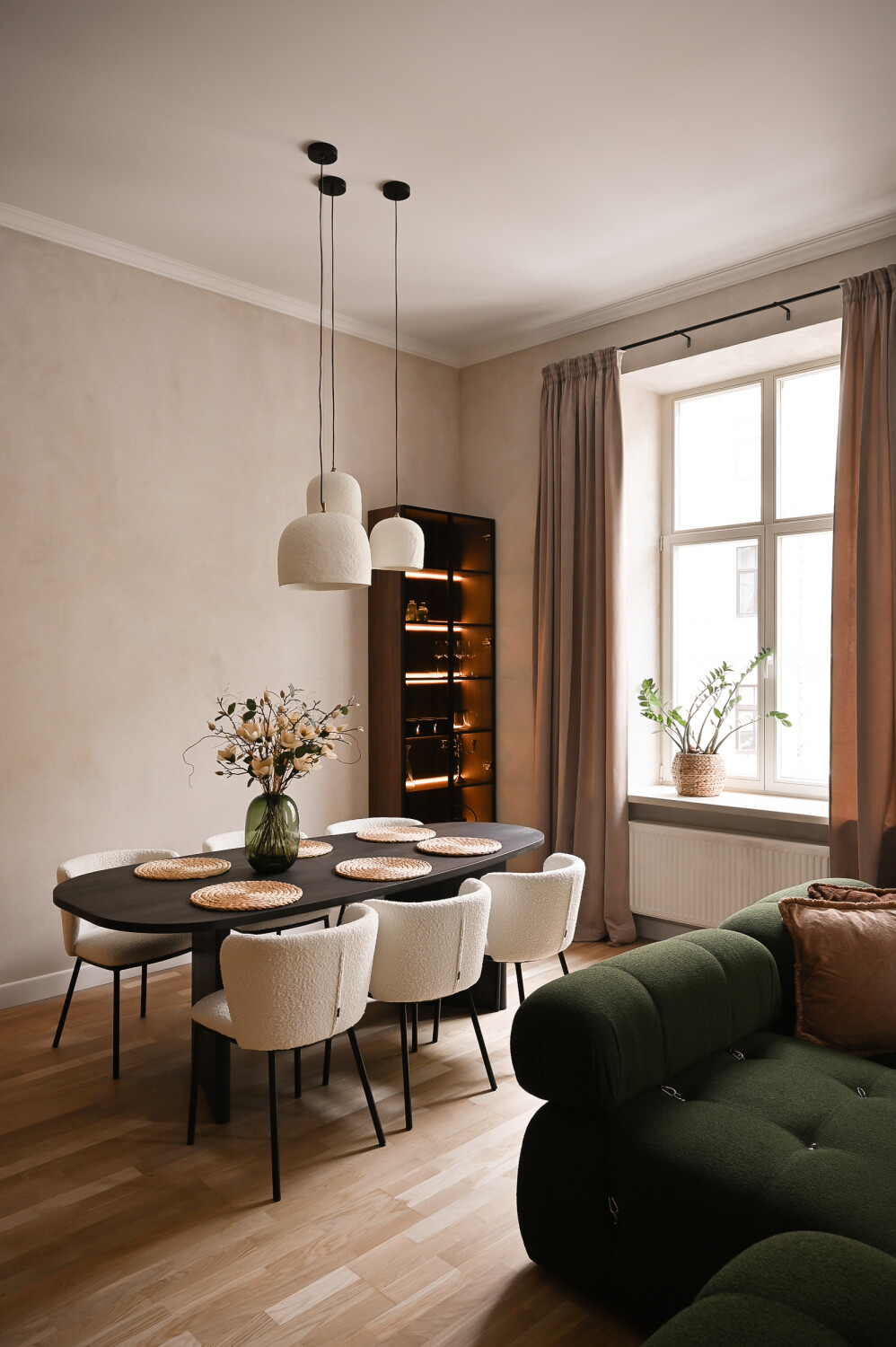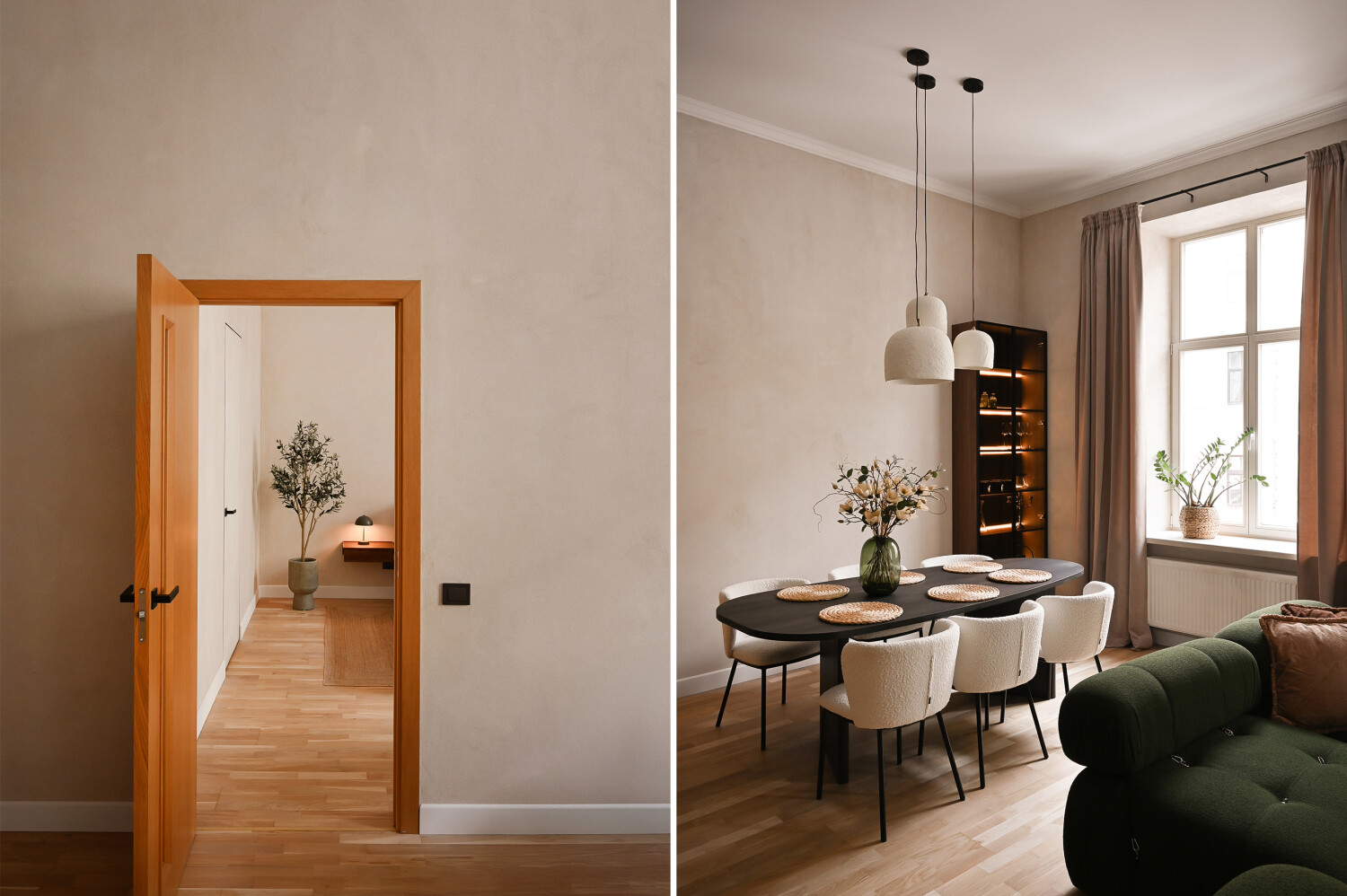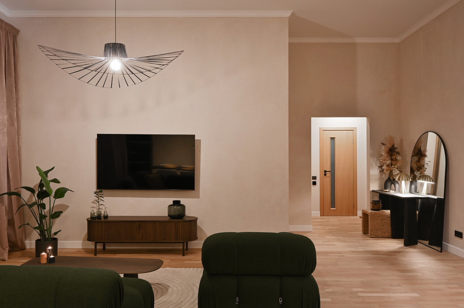 Atvērtā tipa dzīvojamā zona apvieno elegantu viesistabu ar pilnībā aprīkotu virtuvi, radot ideālu vidi ikdienas komfortam.