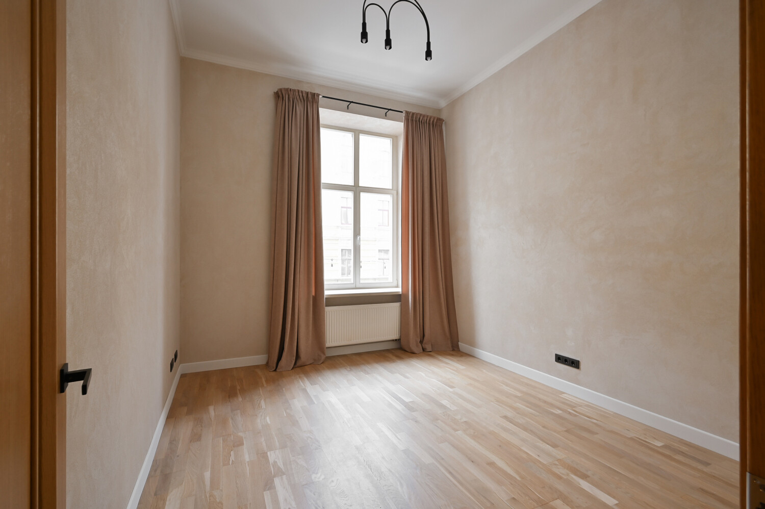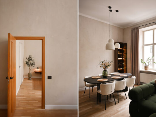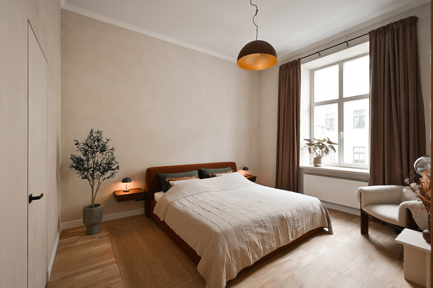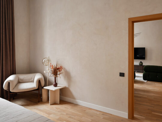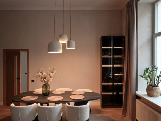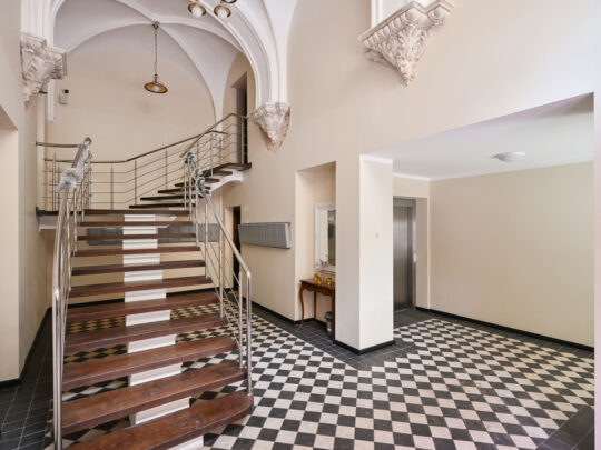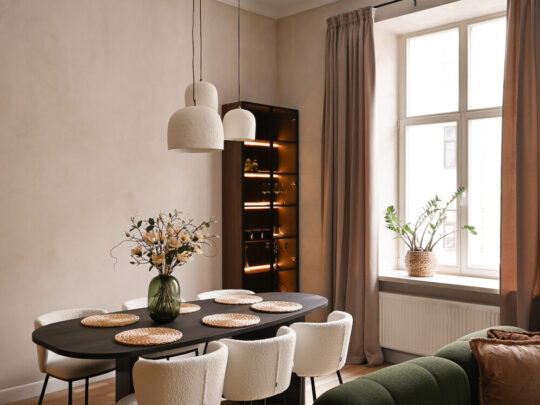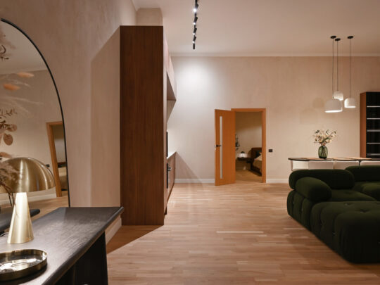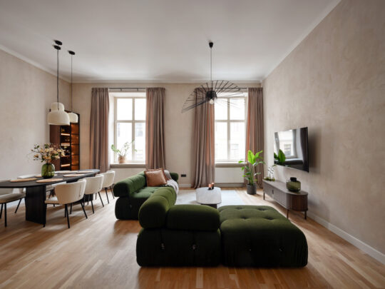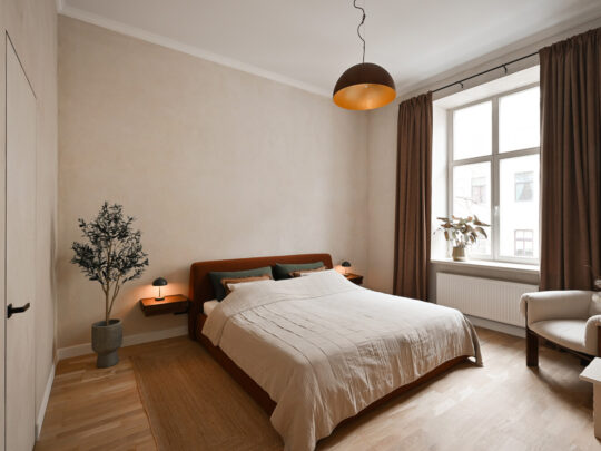 Dzīvokļa kopējā platība ir 105 m², un tā interjers izceļas ar pārdomātu telpu kompozīciju, augstiem griestiem, plašiem logiem un dabīgā koka parketa grīdām, kas telpām piešķir gaismu, plašumu un mājīgu noskaņu. Dzīvoklis ir pilnībā mēbelēts ar augstas klases dizaina mēbelēm un aprīkots ar kvalitatīvu sadzīves tehniku.