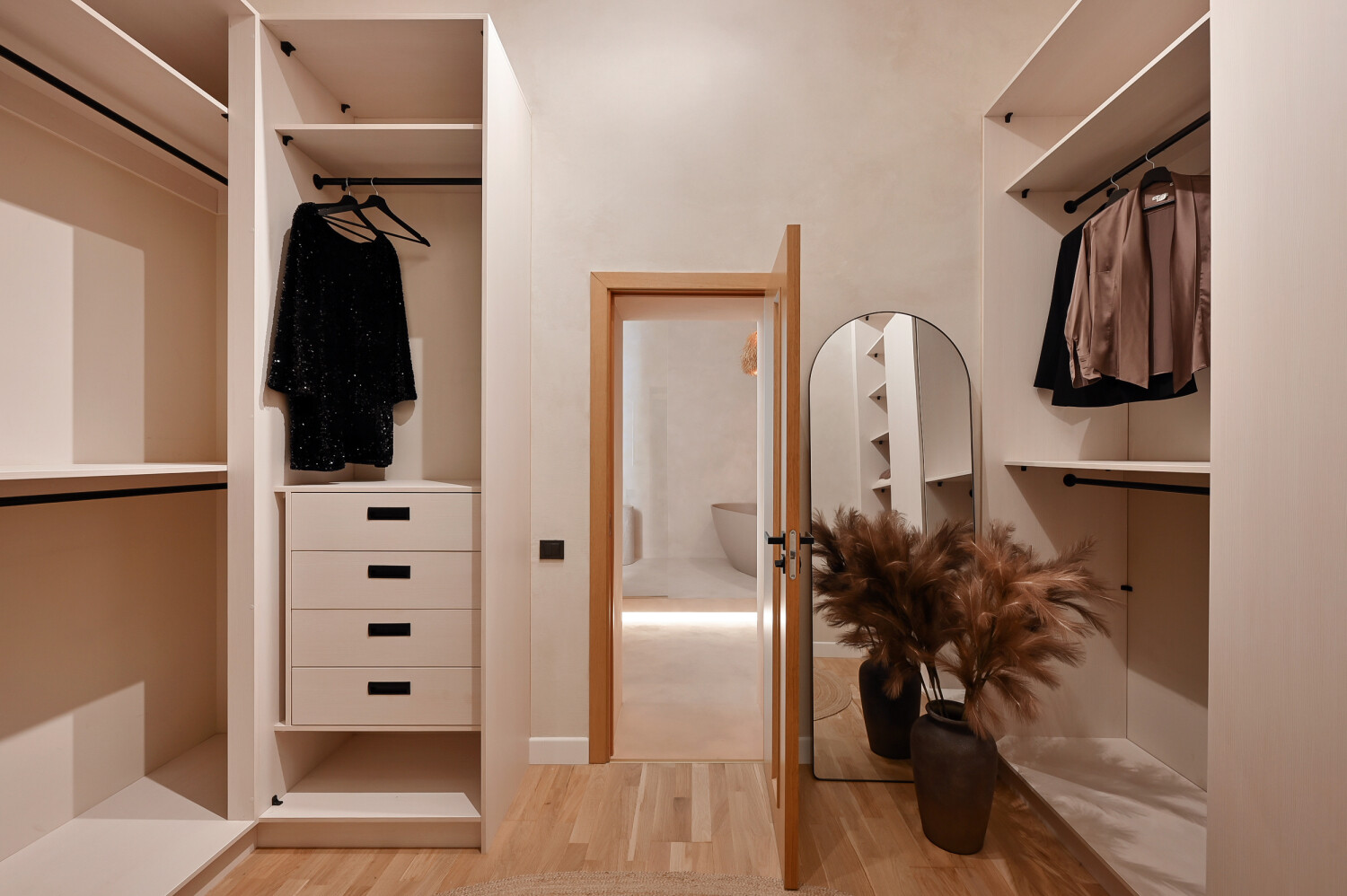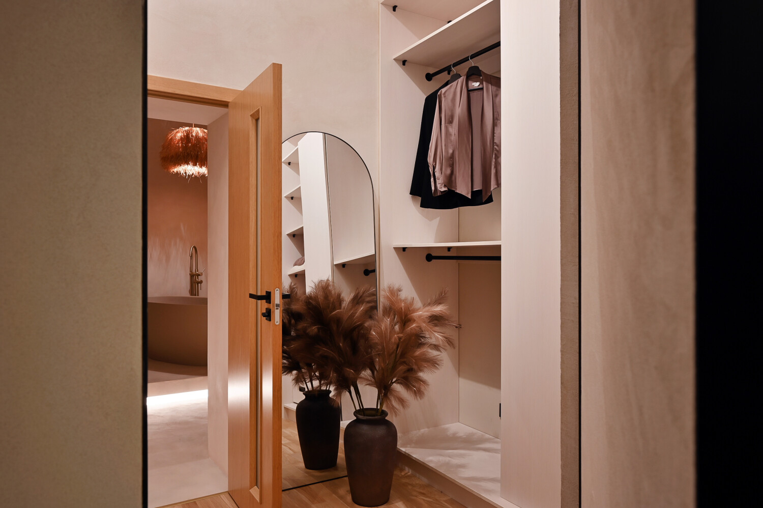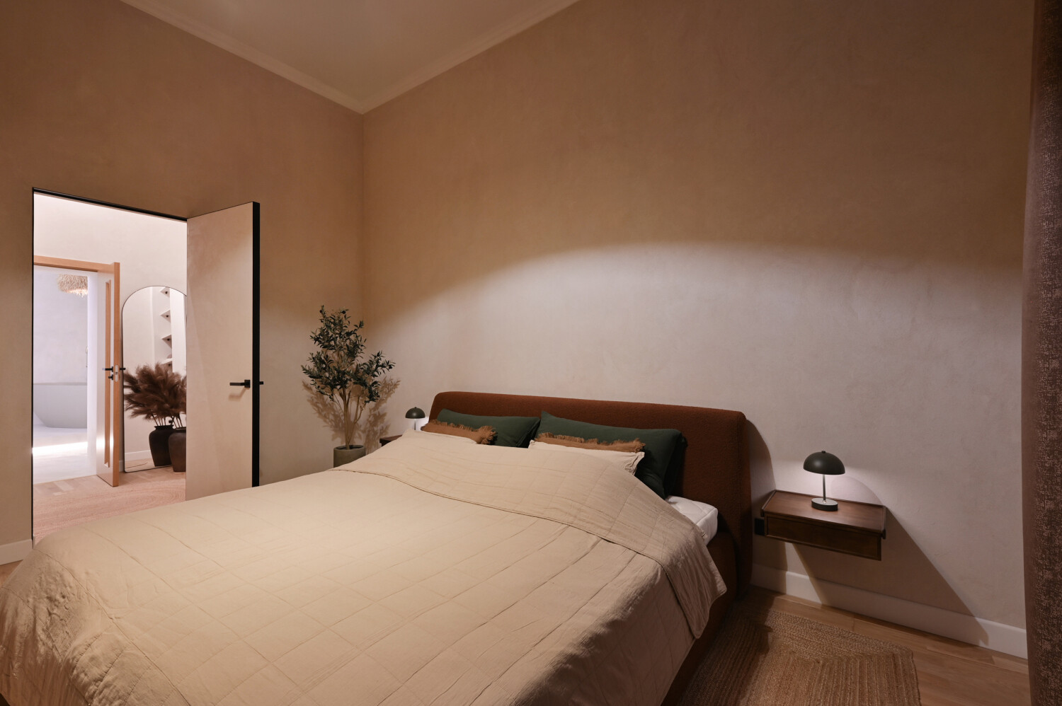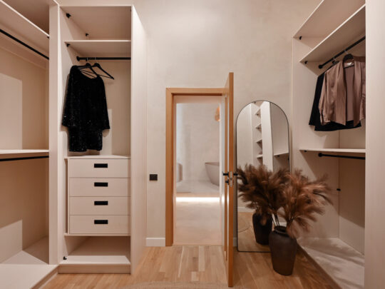 Divas izloletas guļamistabas nodrošina privātumu un mieru — galvenā guļamistaba papildināta ar garderobes telpu un plašu privāto vannasistabu ar vannu un dušu.